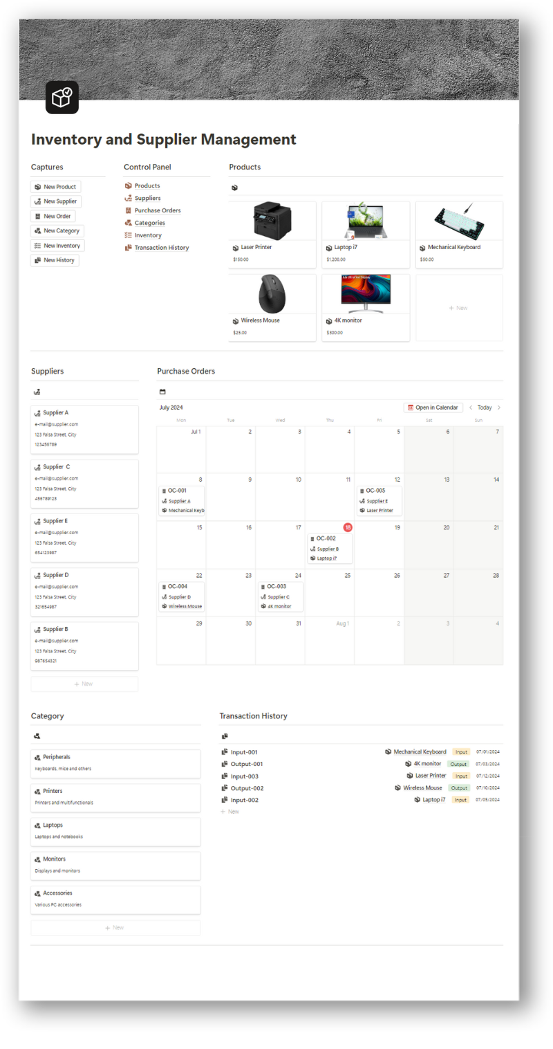Are you looking for a comprehensive, centralized solution to manage your company's key operations? Our Business Management Suite for Notion is the ultimate package that combines three essential tools in one: Inventory and Supplier Management, Budgeting and Corporate Finance, and Human Resources Management. Designed for entrepreneurs, managers, and teams looking to maximize their operational efficiency, this suite gives you complete control over your business from a single, intuitive, and customizable platform.